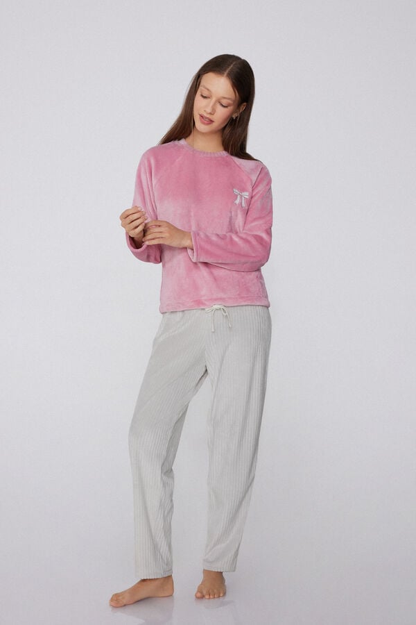 - > Long Fleece Pyjamas with Embroidered Bow Print