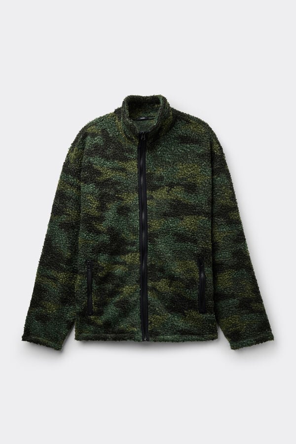 Giacca in pile effetto teddy con zip, collo a lupetto e tasche.
