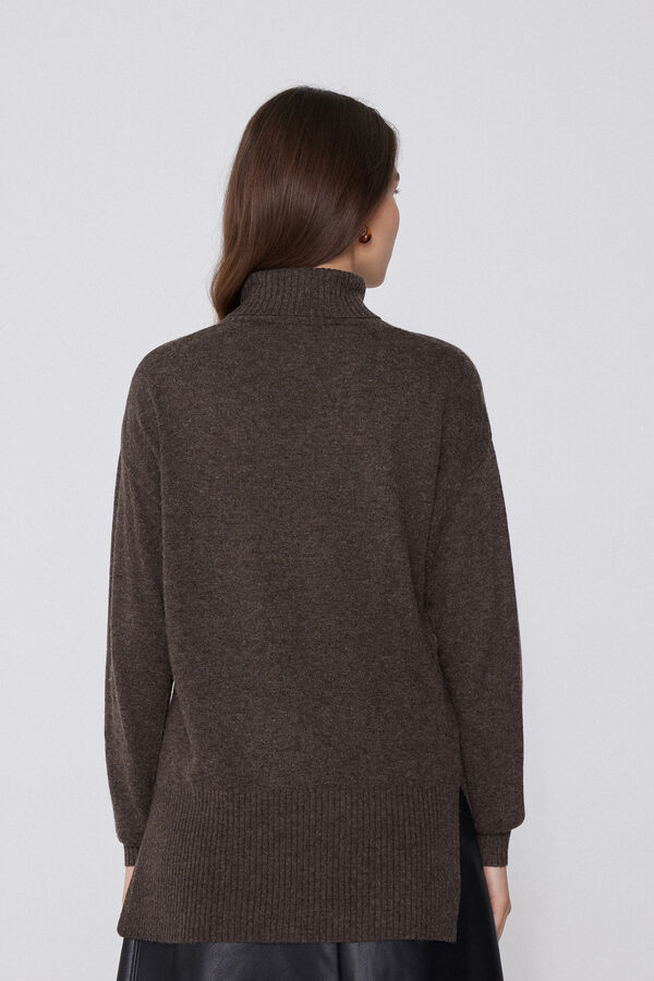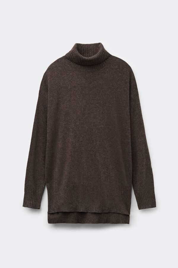 Длинная водолазка из теплой смесовой шерсти с высоким воротом, длинными рукавами и боковыми разрезами.