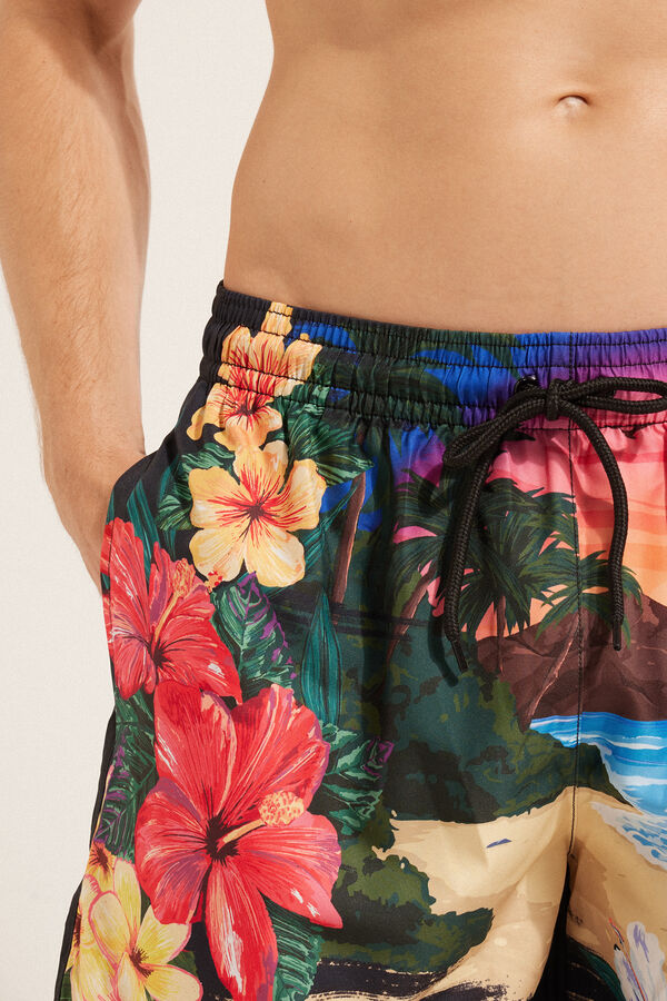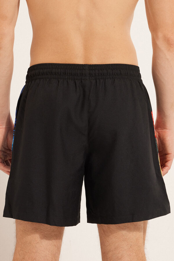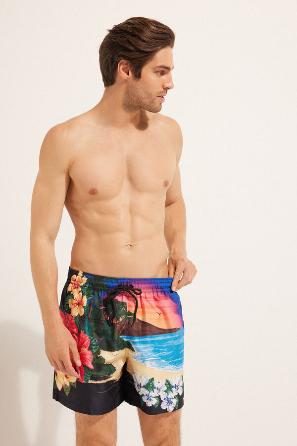 Short swimming shorts in recycled printed canvas with pockets, a soft inner mesh and a drawstring waist. Quick-dry fabric. Regular fit.